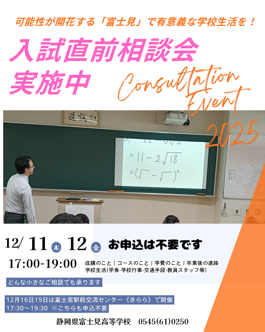 12月 8・9・10日の3日間で、約40組の中学3年生と保護者の皆さまにご参加いただきました! お越しいただき、本当にありがとうございます。 本校での相談会は残り「11日・12日」の2日間となります。 来週は富士宮駅前交流センター〈きらら〉で 16日・19日に開催します! 大きなイベントは終了しましたが、 「もっと富士見のことを知りたい」 「出願校を決める前に話を聞きたい」 そんな方にピッタリの相談会です。事前申込み不要で参加できます! ご来場をお待ちしています。