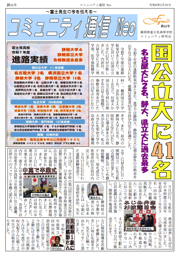 ~富士見生の今を伝える~「コミュニティ通信Neo 第42号」をアップしました。 第42号は、令和7年度の進路結果と卒業式を中心に、富士見生の活躍をお伝えしています。ぜひ、お読みください!